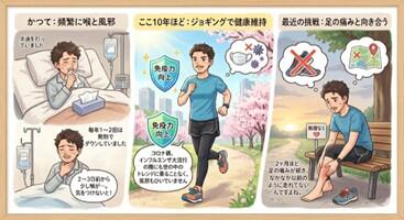 以前は、すぐに喉をやられて、病院で点滴を打っていましたし、毎年1~2回は発熱でダウンしていました。しかし、ここ10年ほど振り返ってみると、毎朝のジョギングを日課で始めたからでしょうか、コロナ禍やインフルエンザ大流行の際にも世の中のトレンドに乗ることなく、風邪もひいていません。