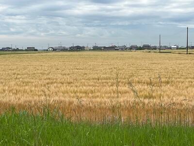 毎日の通勤路として使っている国道501号線。横島から長洲町までのほぼ直線道路の両側には、麦畑が広がっています。周りの花や木々は、新芽を出して日に日に鮮やかになるのに対して、逆に麦畑はそれまで鮮やかな緑色だった姿から、まさしく“小麦色”に変身していくのです。