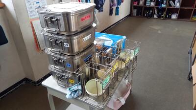 給食の後片付けの様子です。食べ終わったら、係の児童がてきぱきと片付けを行い、運びやすいように整理をしていました。