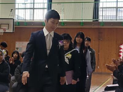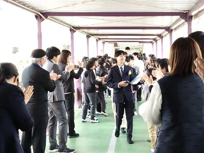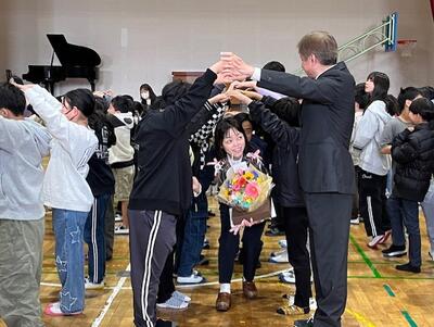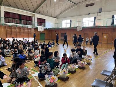 式の後は、全校児童で作ったアーチをくぐりながら退場していただきました