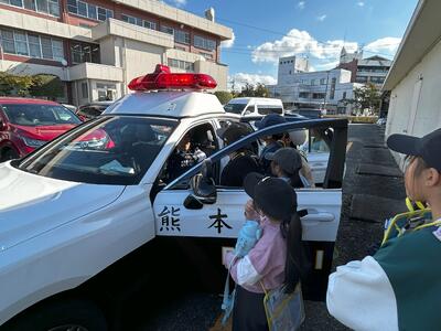 警察の方から、警察官のお仕事について話を聞いたり、パトカーに乗せていただいたりしました。また、最後には、全員で、敬礼のポーズで写真もとりました。
