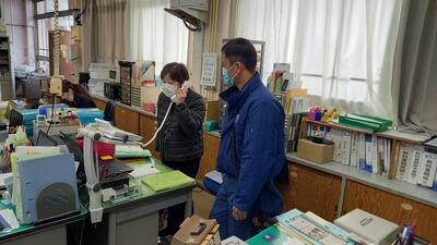 事務の本村先生が消防署に通報中です。電話対応の仕方を教えていただきました。