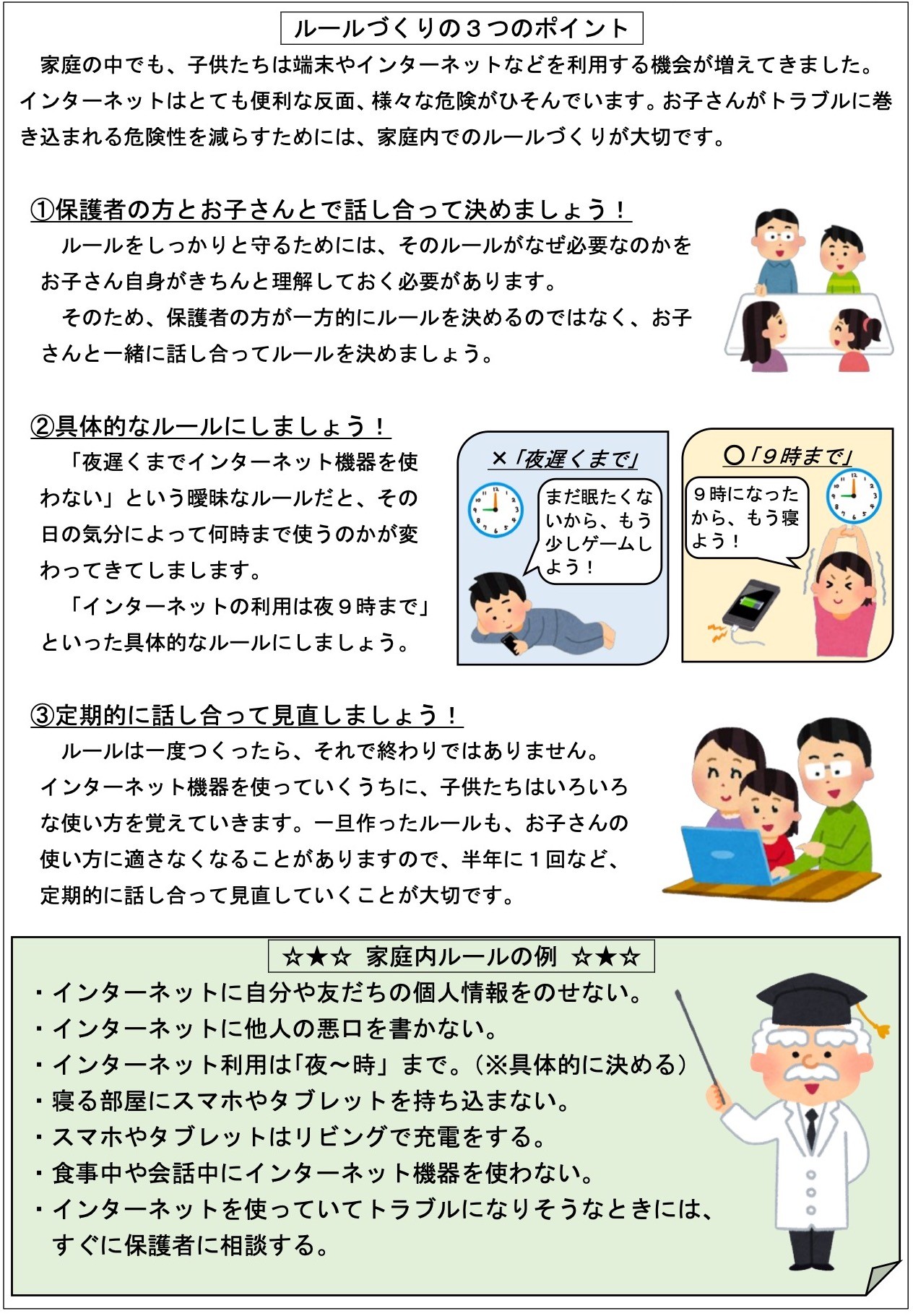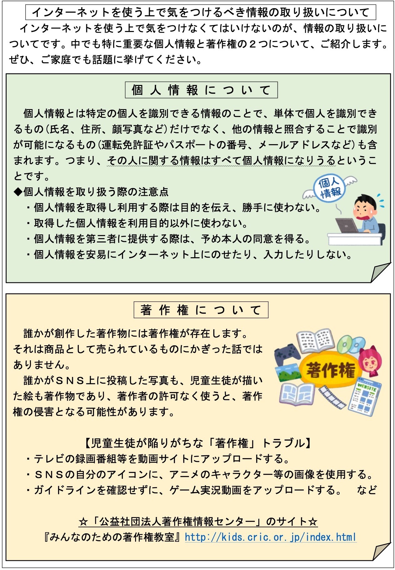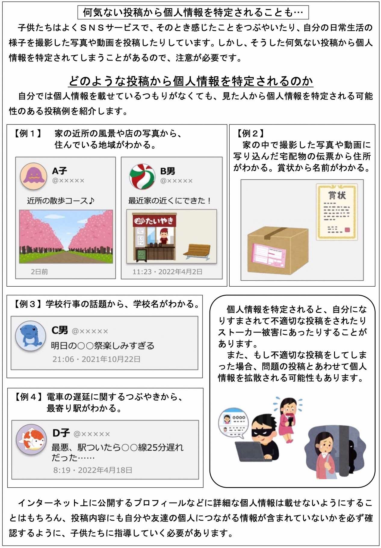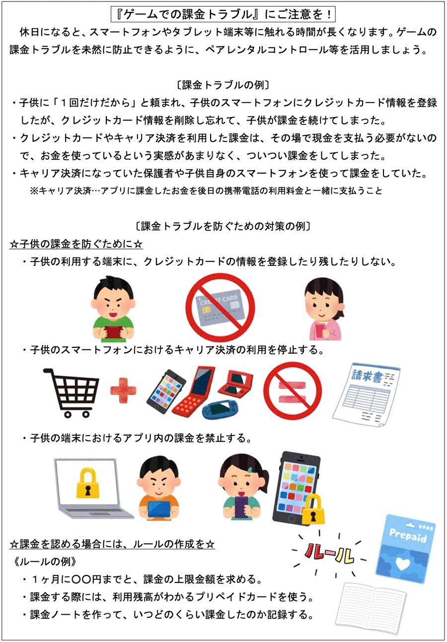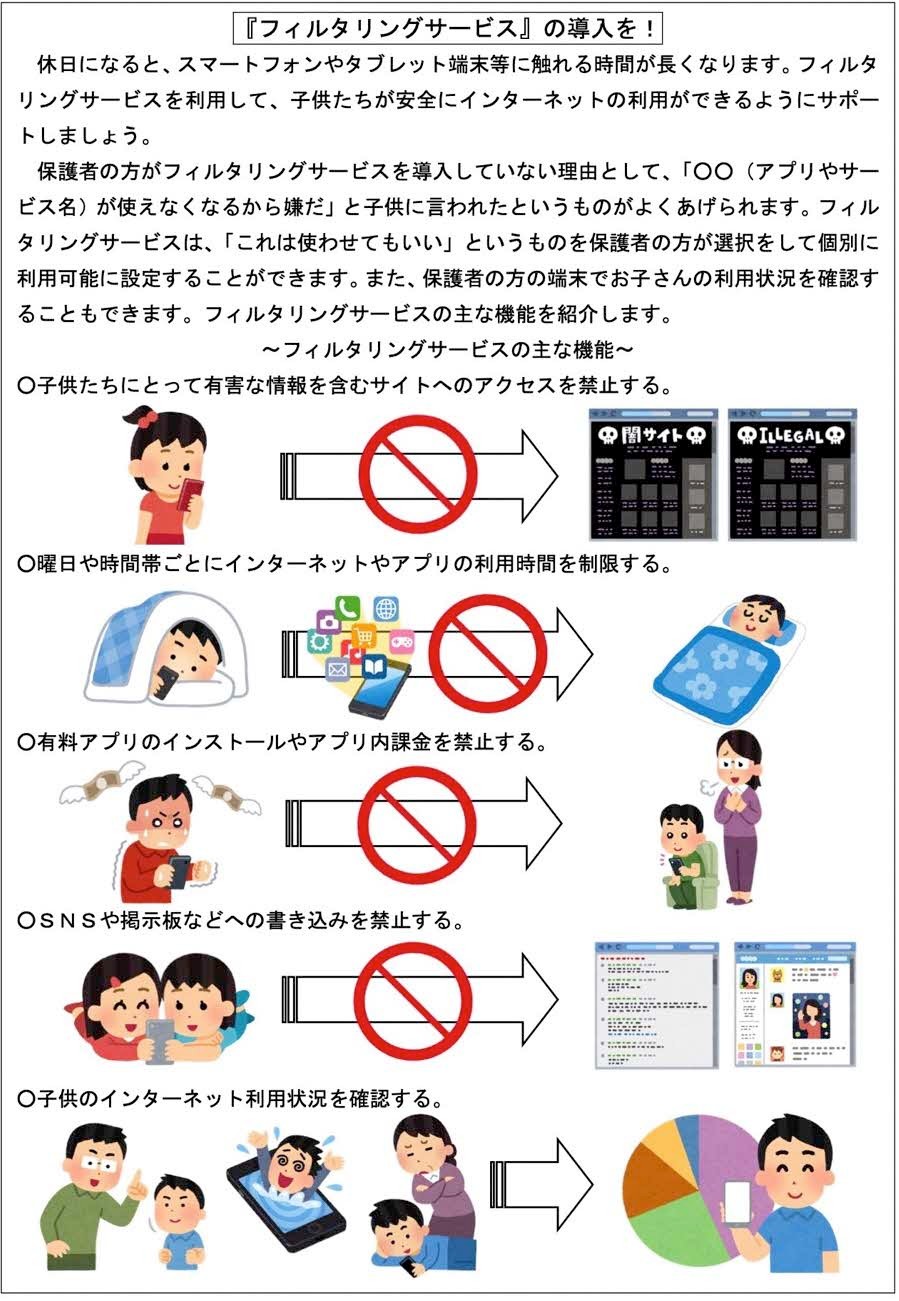 子供たちがICT機器等を安全に活用できるように、是非ご一読ください。(①フィルタリングサービスについて ②ゲーム課金のトラブル防止について ③位置情報共有アプリについて ④インターネット上の書き込みについて ⑤家庭でのルールづくりについて ⑥個人情報と著作権について)