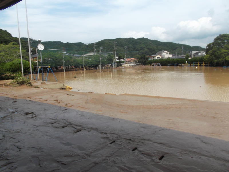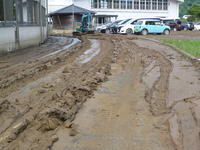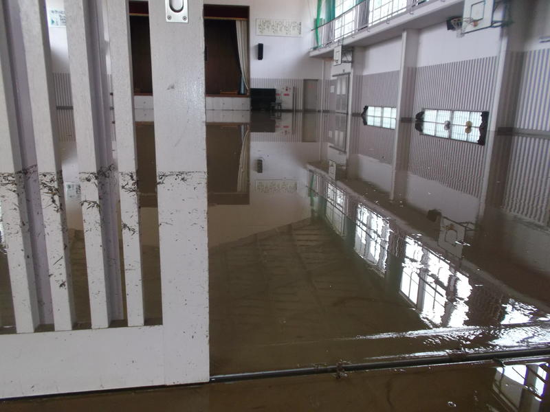 玄関口から見た運動場(浸水し泥土で覆われ、歩くのもやっとの状態でした)