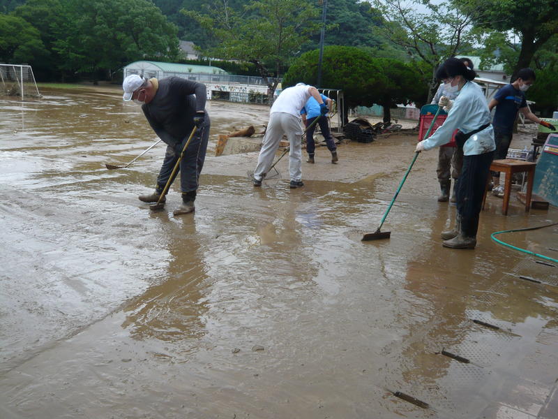 雨が降り続く中、県P連のみなさんが重機を使って学校周辺の汚泥をかき出してくださいました。