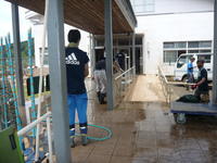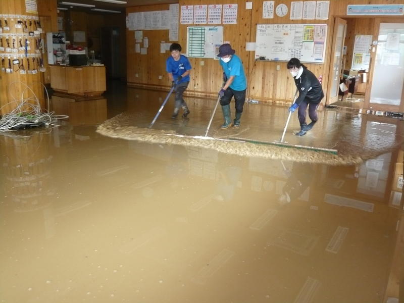 雨が上がった午後からは、浸水した低学年教室の机や椅子を水洗いして拭き取る作業を行いました。