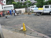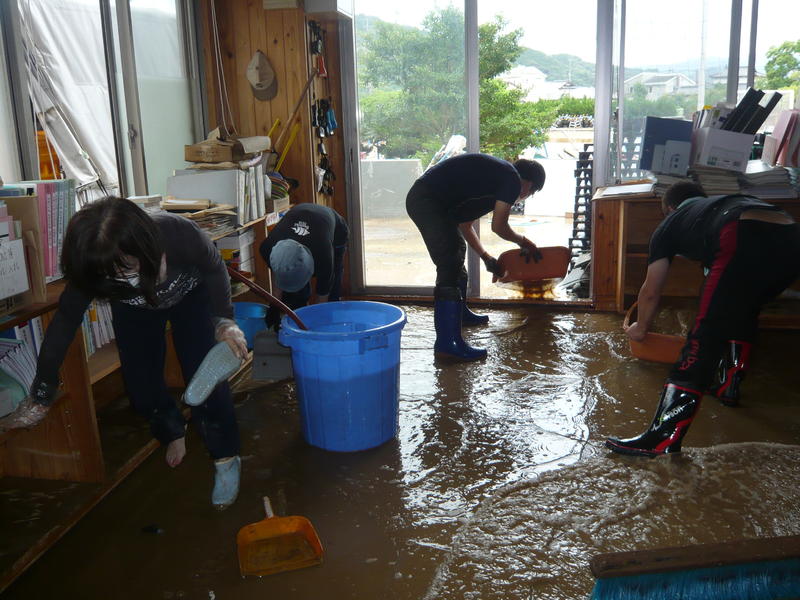 排水溝がなく、ちりとりなどでくみ上げて外に出すという地道な作業でした。