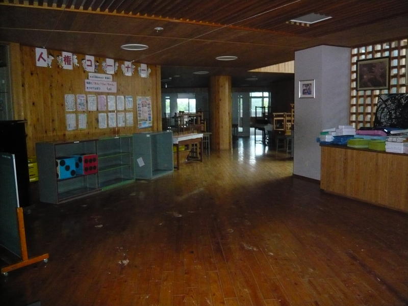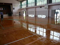 多目的ホールと校長室前ホールの様子です。床板と汚泥を取り去ってありました。