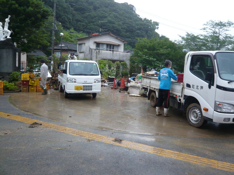 雨でびしょ濡れになりながら、撤去物をトラックに積み込んでいるところです。災害ごみ置き場まで往復2時間以上かかるときもありました。