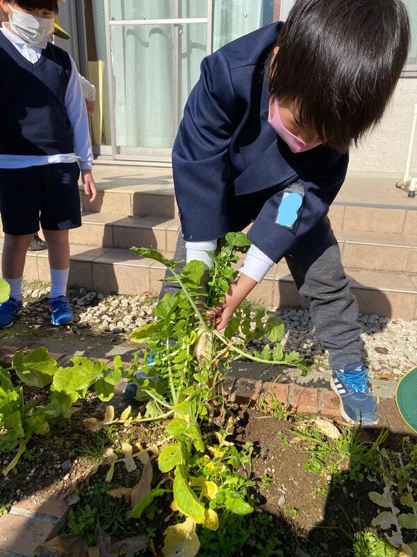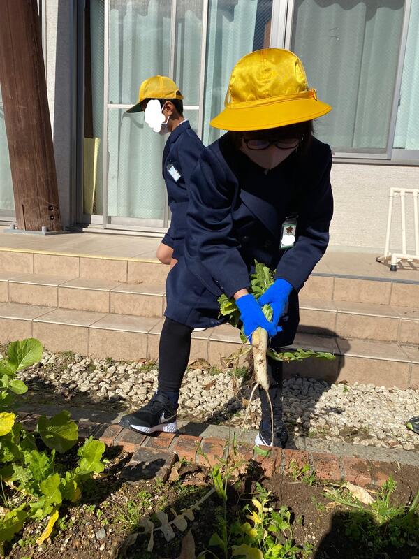 1年生では、秋に種まきをした大根や人参などの野菜の収穫を行いました。大根は予想より小ぶりでしたが、1年生にとっては大根を抜くことは一苦労!国語の「大きなかぶ」を思い出すほど、力を込めて一生懸命に引き抜きました。抜いた瞬間には満面の笑み!