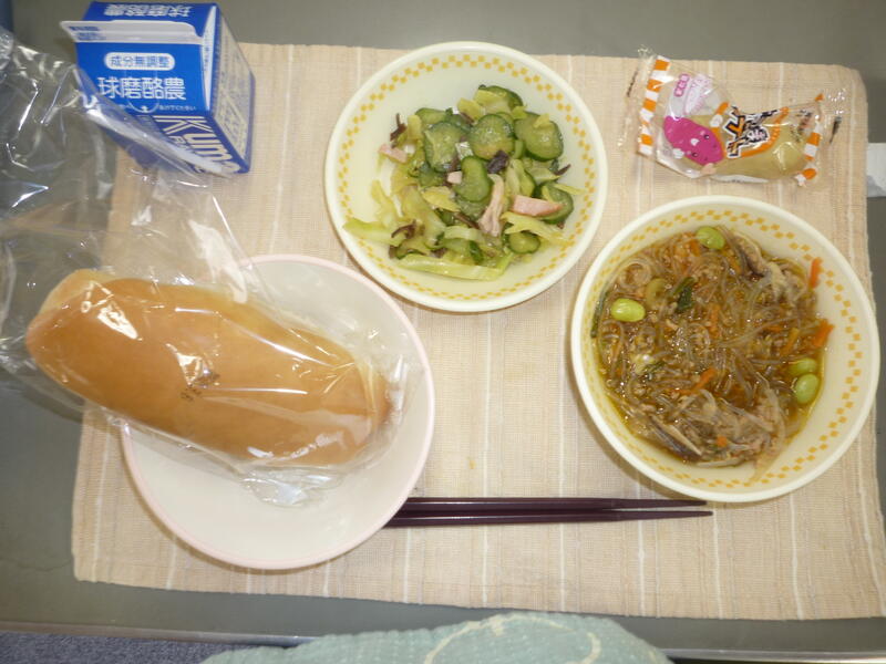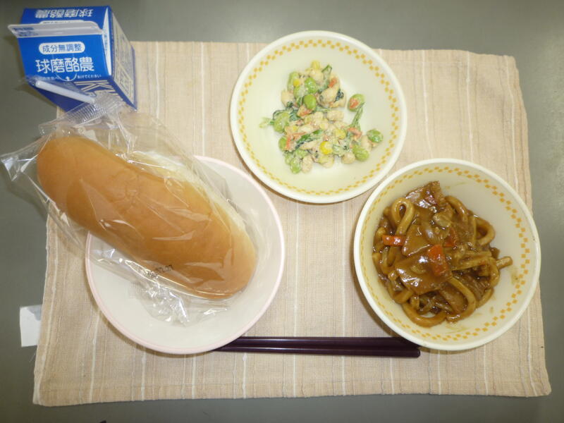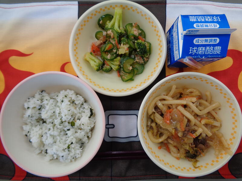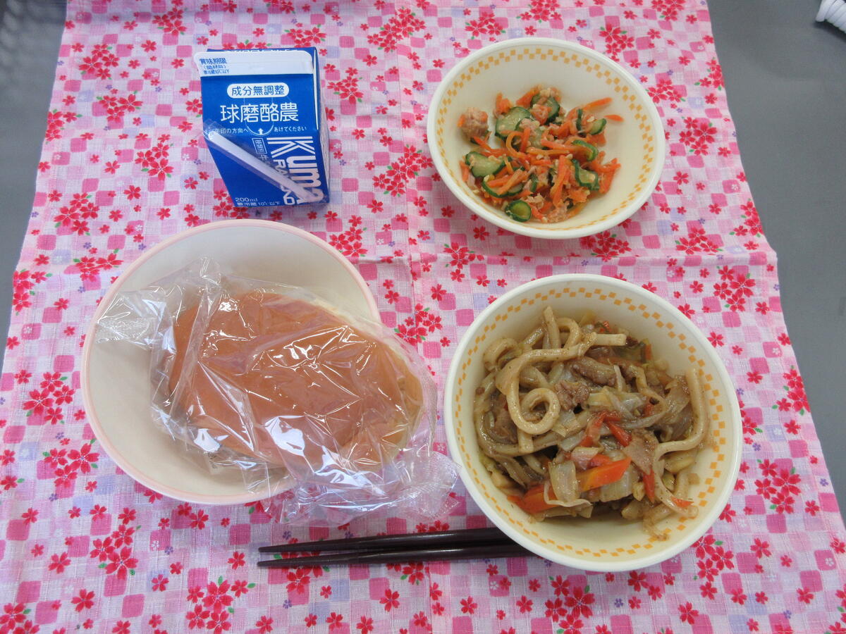 今日の給食は、焼きうどん、キャロットサラダ、ミニミルクパンと牛乳でした。