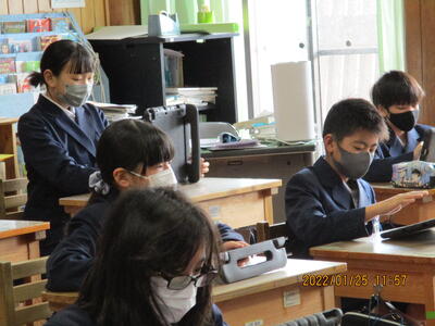 今回は、現5年生の授業をリモートで中継してもらい、学びの内容や学び方について見学しました。