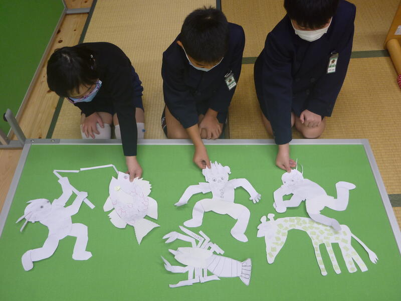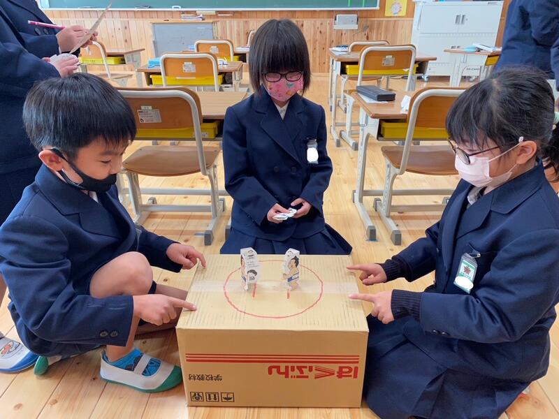 1年生の生活科の「ふゆのたのしみ」の学習では、日本の伝統的な遊びである紙相撲をして楽しみました。相撲自体を知らない児童も複数いたため、相撲について説明をし、紙に力士の絵を描いて切り取り、力士名をつけて対戦を楽しみました。教室は大盛り上がり!休み時間になると、「紙相撲をしていいですか。」と尋ねて対戦に夢中になっています。