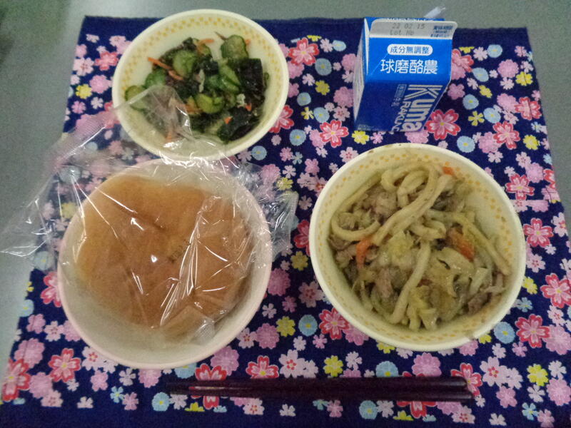 今日の献立は・・・わかめご飯、うどんすき、ブロッコリーのシモン和え、牛乳でした。