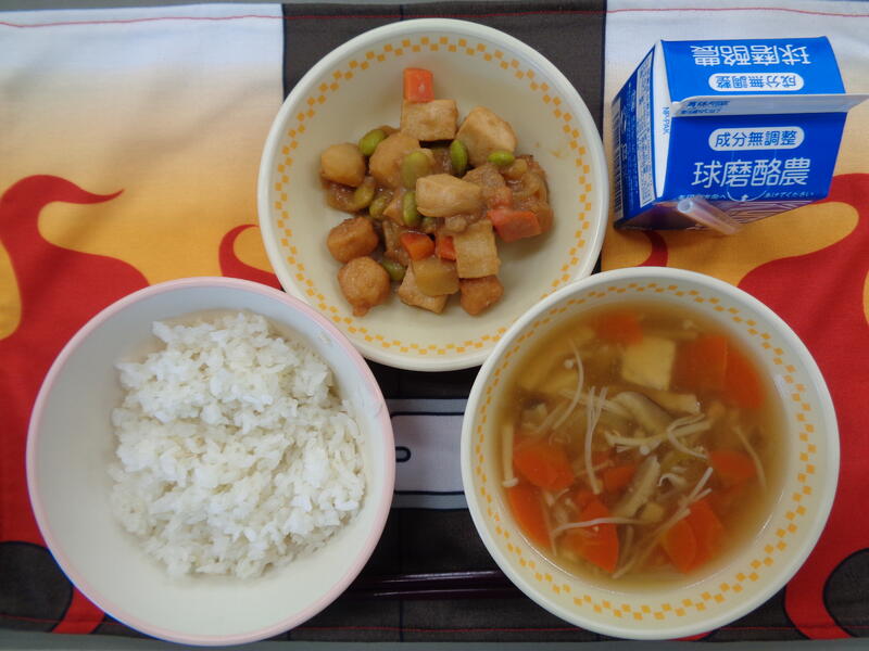 今日は、子どもの頃に母が作ってくれたみそ汁に思いを馳せながら、麦ごはんと一緒に大根のみそ汁をおいしくいただきました。また、ひじきの炒り煮は、たっぷり使われていた大豆との相性もよく、ご飯のおかずとしてもバッチリでした。大好きなレンコンのはさみ揚げは、歯ごたえもよくおいしかったです。今日もおいしい給食に感謝!でした。