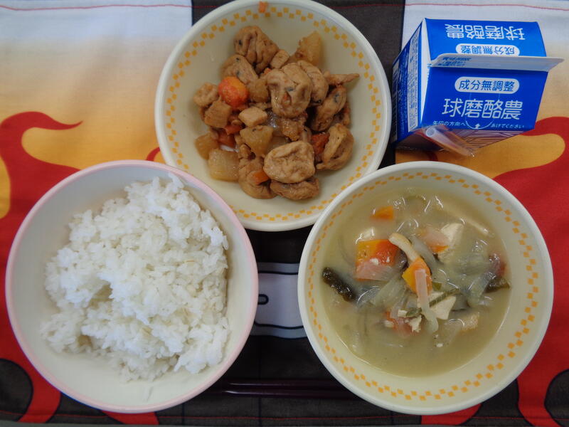 「ぐる」は土佐(高知県)の方言で、集まり・仲間という意味があるそうです。今日の「ぐる煮」には、名前のとおり、根菜類をはじめたくさんの具材が煮込まれており、麦ごはんにぴったりのおかずで、おいしくいただきました。