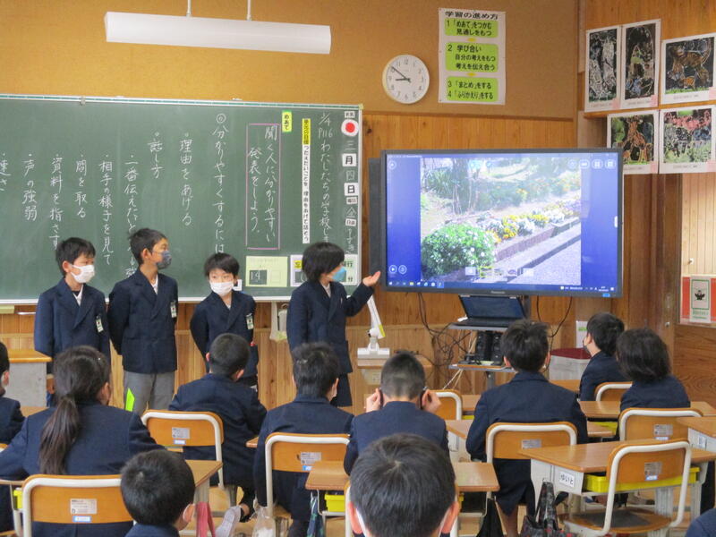 本年度も残りわずかとなりました。5年生は、総合的な学習の時間に「SDGs」「環境問題」「食品ロス・環境にやさしい食べ物」「水俣病」などについて学んできました。さらに学びを深めるために、個人課題を設定し、調べたことを自分なりに構成してまとめました。そして、自分の学びをタブレットを用いて報告し合いました。この一年、自分たちでまとめる力もついており、資料の提示や言葉の使い方を考えながら分かりやすく報告する姿に成長が見られました。