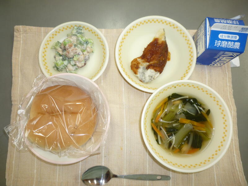 今日の献立は・・・丸パン、チキンビーンズ、フレンチサラダ、フルーツ杏仁、牛乳 でした。