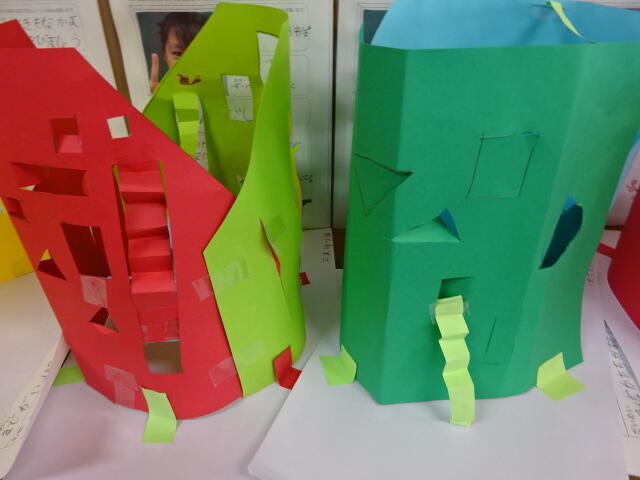 子どもたちは思い思いに建物の窓やドア、そして階段を作っていました。