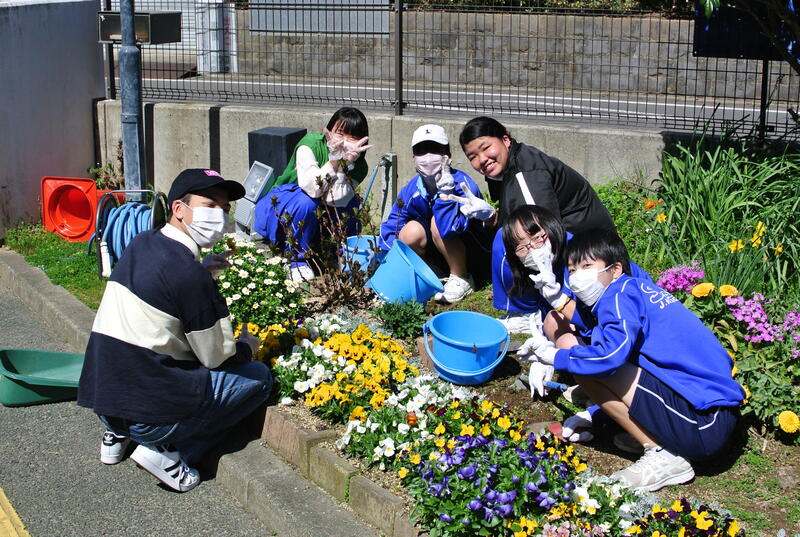 先日佐敷中学校を卒業した3年生(佐敷小出身)6名が、花壇の手入れボランティアに来てくれました。笑顔が素敵ですね!「人のために考動」する先輩の姿は、小学生への刺激になります。ありがとうございました!
