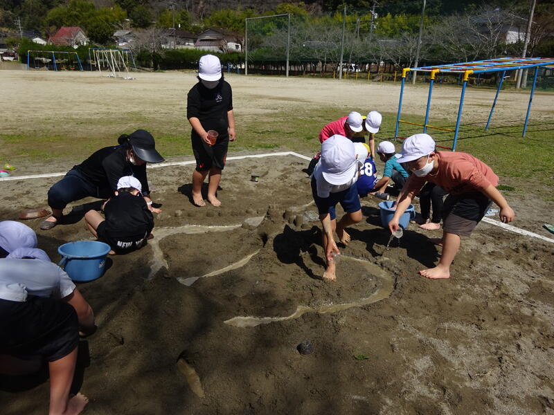 春の穏やかな季節を感じる青空の下、1年2組は新しくなった砂場で「さらさら どろどろ いいきもち」の学習をしました。本来は、もっと早くにしたかった学習ですが、豪雨災害の影響で砂場の安全が確認できていなかったため延期になっていました。しかし、工事も完了して温かくなった今日、心待ちにしていた学習を行うことが出来て子どもたちはみんな笑顔でした。