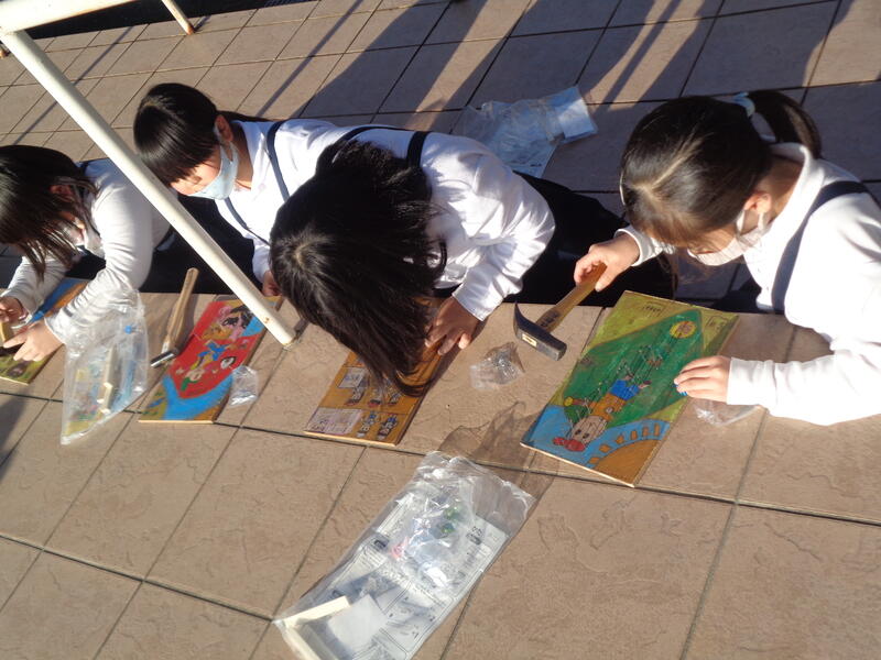 12月20日、寒い寒い日でしたが、日が差す渡り廊下はポカポカと暖かく、釘を打つトントンという音がリズミカルに響き、子ども達は「楽しい!」と夢中になって金づちを使っていました。