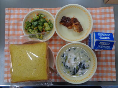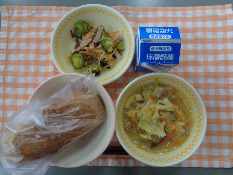 献立:ミルクパン、肉団子の中華スープ、キャベツとにんじんの醤油にんにく炒め、牛乳