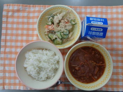 献立:麦ごはん、根菜カレー、ちぐさ和え、牛乳