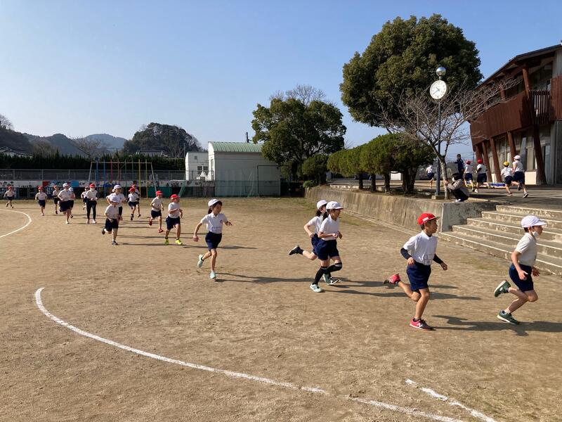 2年生は、みんな上着を脱いで張り切ってスタートしました。低学年のコースは一周約130m。6周走った子が多かったようです。