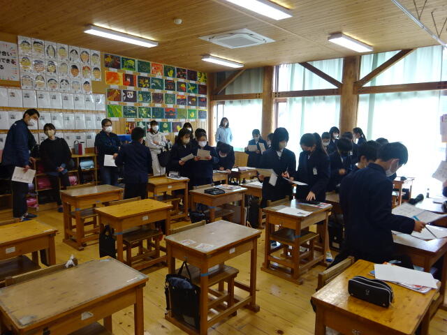 佐敷、芦北町は、歴史的に重要な地域です。日本の歴史の出来事や歴史上の人物とのつながりも多いです。今回は、芦北の歴史に詳しい教育委員会の深川さんを講師にお招きし、授業を行いました。古墳の話から太平洋戦争の空襲の話まで、日本の歴史の出来事と芦北の出来事を結びながらお話をいただきました。生まれ育った芦北の町の歴史について知ることができ、最高の卒業祝いをいただいたのではないでしょうか。これからも、芦北の歴史を大切にしてほしいです。