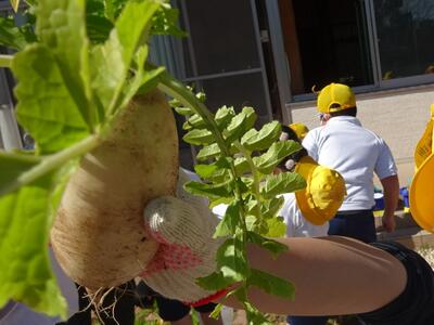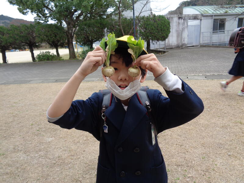 ブロッコリーはかわいい花を咲かせているし、キャベツは青虫たちのごちそうになっているし…。それなりに役割は果たしているような気もしますが、当初の予想とは全く変わってしまいました。それでも、カブは食べられそうと抜いてみると、小さいけれど形の良い真っ白なカブが出てきました。3年生の子ども達だけでなく、下校時通りかかった他学年の子ども達にも、少しおすそ分けしました。