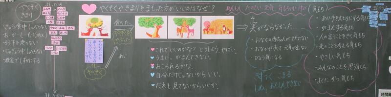 道徳の時間に「約束やきまりを守ったほうがいいのはなぜか」について話し合いをしました。『オレンジ色の木のみ』という題材と自分の生活を重ね合わせて考え、約束やきまりを守ると「安心できる」「楽しくなる」「元気になる」「気持ちがいい」「仲良くなれる」などの意見が出されました。しかし、子ども達は約束やきまりを守ることの大切さは頭でよく分かっていますが、行動できるかとなると難しい時があるようでした。学習の最後にはこれからどんな生活をしていくかについて目標を持ちました。日々の生活の中でこの学びを生かせるとかっこいい2年生になりますね。