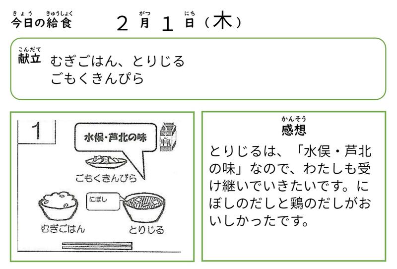 学活で水俣病について学びました。水俣病がどのようにして起きたかを知り、海が汚れたことによって病気になって苦しんだ人がたくさんいたことやきれいな海を取り戻すために長い時間がかかったことについても学習しました。その後、道徳で「胎児性水俣病」の兄を持つ人の詩を読み、水俣病の患者さんやその家族の苦しみや思いについて考えました。