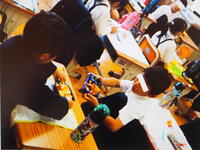 図工の時間に、算数ボックスに入っているおはじきやブロックなどを自分の机の上に並べて遊びました。物の数や色や形のきまりを自分で考えながら「並べる」ことの理解を深めました。その後、4人グループになってせんたくばさみ・ストロー・折り紙などを並べて遊びました。出来上がった作品を見て回りながら、それぞれのグループの並べ方の良さに気づき「すご~い」「きれい!」と歓声を上げていました。
