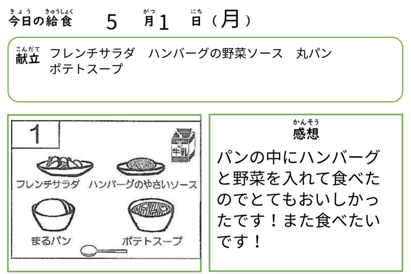 今日は、昨日までの給食の感想をお伝えします。子供たちも上手にまとめられるようになってきました。