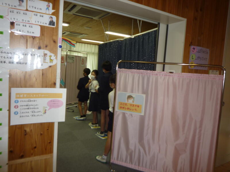 5年生は、歯ブラシをもって静かに順番を待っています。 保健室で自分の順番が来るのを待っています。