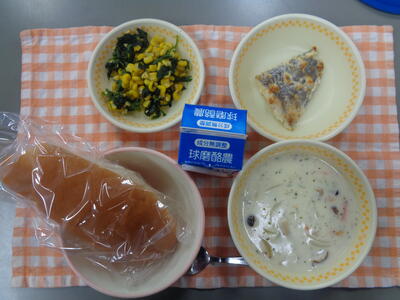 献立:コッペパン、ミルクスープ、魚のマスタード焼き、ほうれん草とコーンのソテー、牛乳