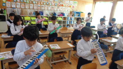 楽譜を見ずに、けんばんハーモニカを弾いています。