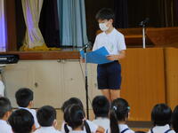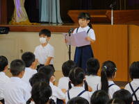 始業式では、各学年の代表が夏休みの思い出と2学期の目標を全校生徒の前で堂々と発表しました。