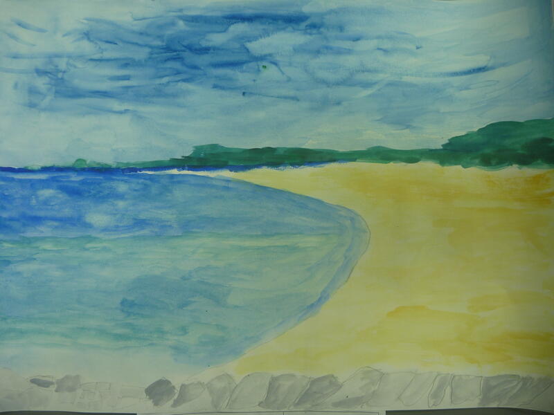 5年生は「海の絵」の水彩画に取り組んでいます。自分が好きな不知火海を描きましたが、海の水を描くのが難しく、水や絵の具の量を調整するのに苦労している様子でした。絵を並べて見ると、時間帯によってさまざまな海の色の変化が感じられ、それぞれの表現の工夫が見られました。