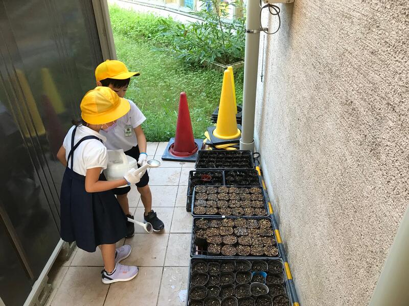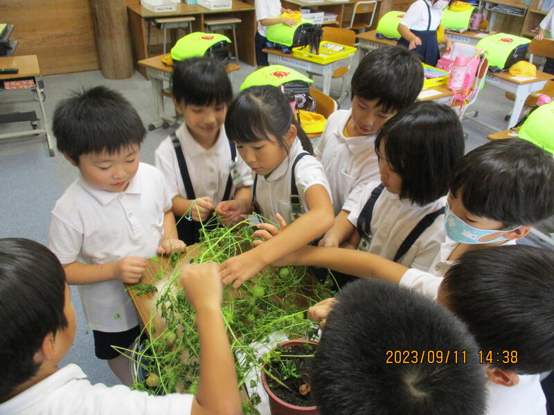 1学期に種を植えた「アサガオ」。夏休み中は家に持ち帰って水かけをしたり花の数を数えたりしました。今は葉っぱが枯れたり種ができたりしていますが、まだまだ変化を続ける「アサガオ」に子ども達は、驚きと感動をもって接しています。