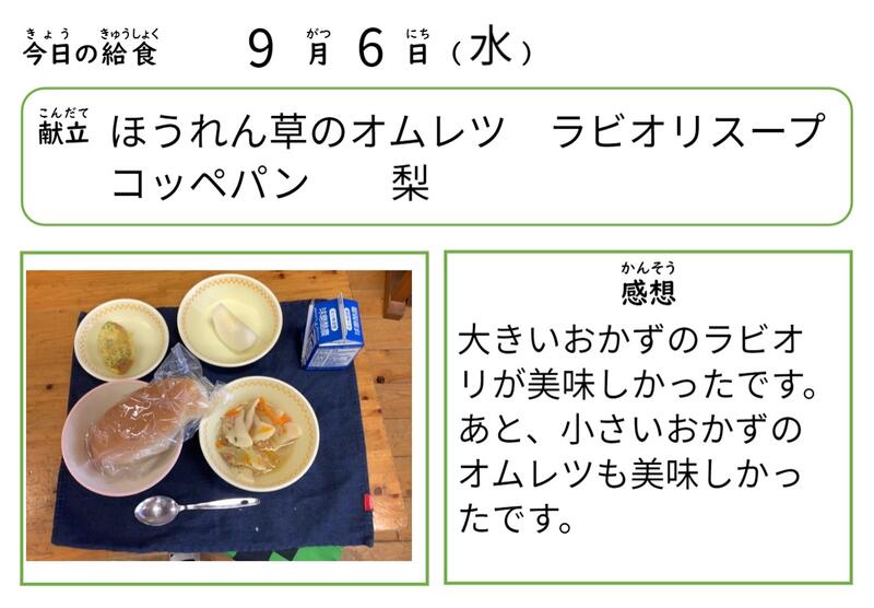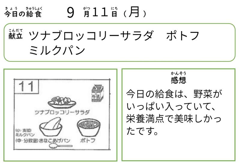 手違いで9月の給食献立が残っていませんでしたので1日からの分を掲載します。