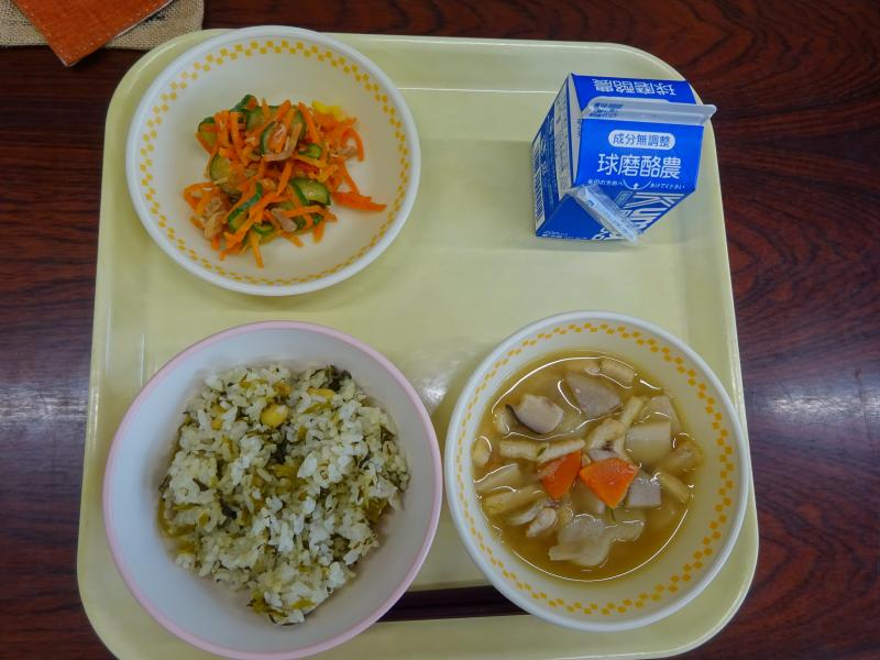 今日は、「くまさんデー」でした。阿蘇地方の郷土料理「高菜めし」と「だご汁」が熊本産でした。野菜物として、にんじんサラダ、そして牛乳の4品でした。