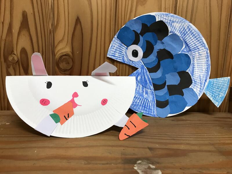 これは、紙皿をつかった「魚のかざり」と「ゆらゆら揺れるうさぎのおもちゃ」です。