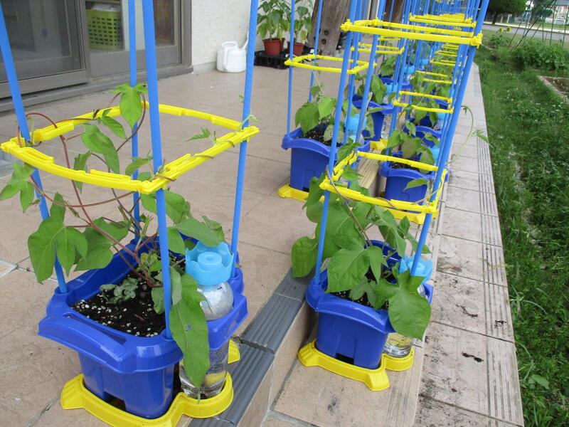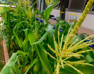 2年生が種まきをして育てているトウモロコシに花が咲きました。