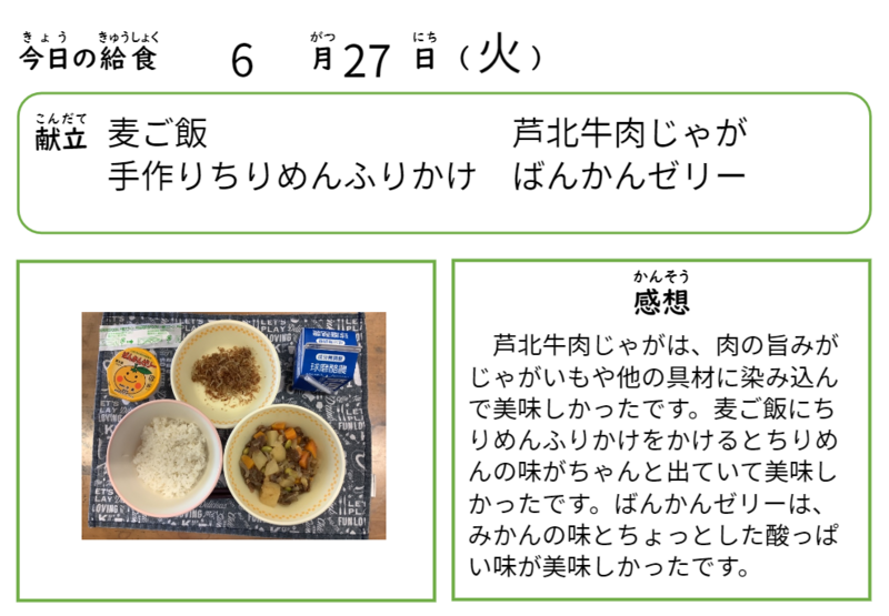 先週もおいしい給食をいただきました。6月9日(金)のメニューは、芦北高校生が考えた「野菜のおいしさを伝えたいメニュー」でした。夏野菜を食べもらうために味付けを工夫してありました。子供の感想にも「ご飯と合って」おいしかったとありました。