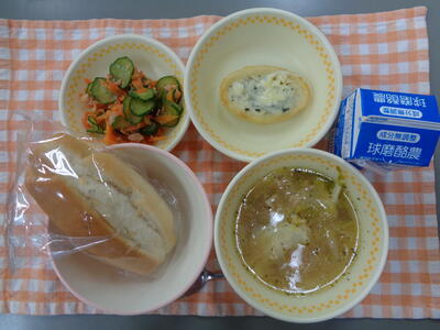 献立:ソフトフランスパン、ラビオリやさいスープ、ポテトカップグラタン、にんじんサラダ、牛乳
