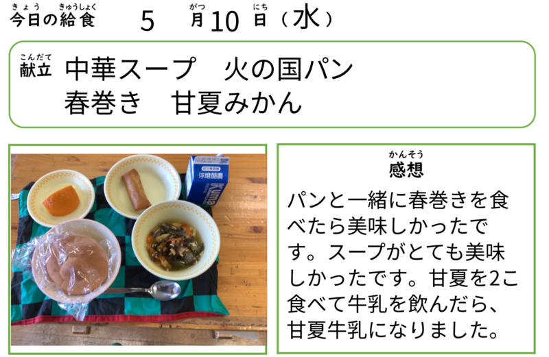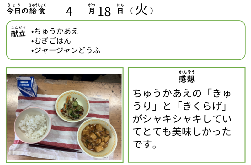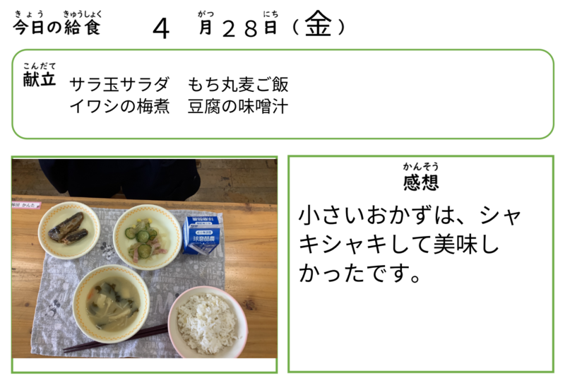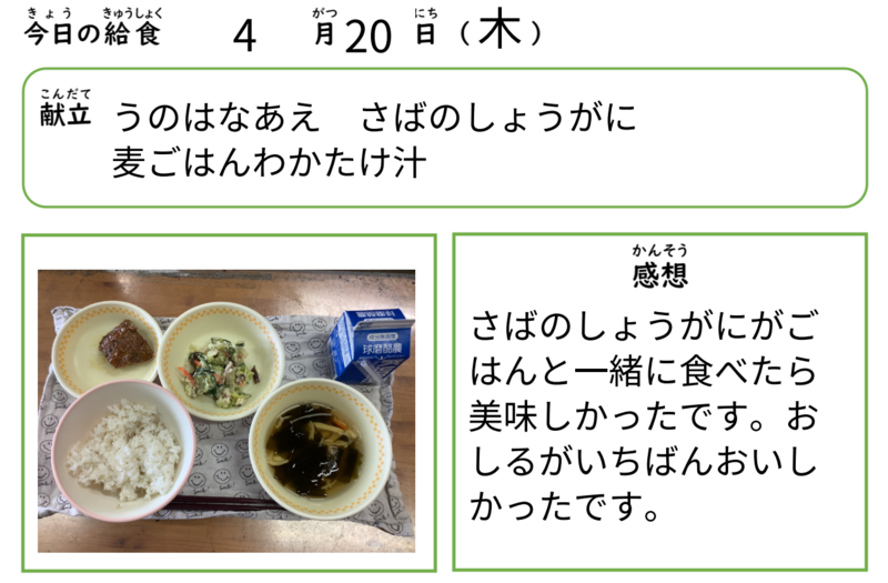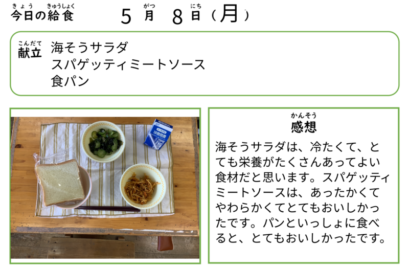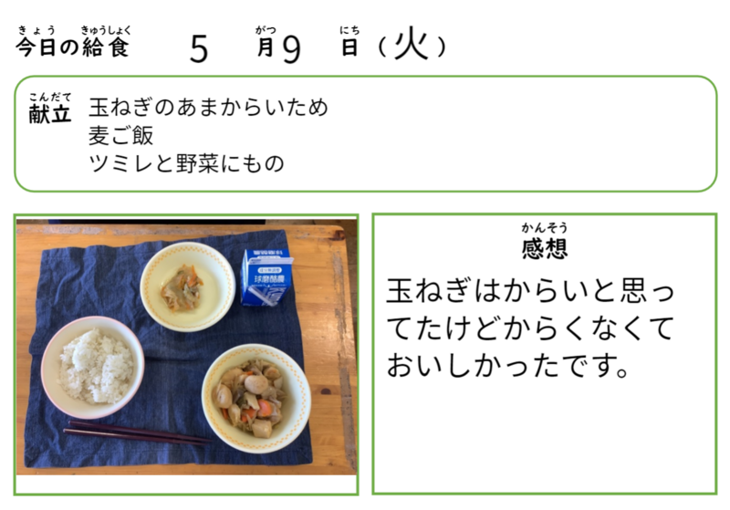 今日は、昨日までの給食の感想をお伝えします。子供たちも上手にまとめられるようになってきました。