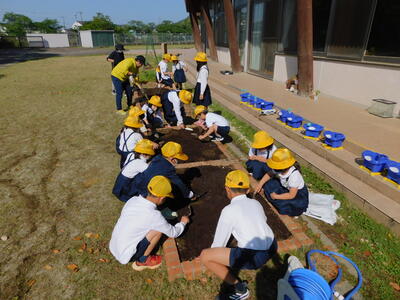 今日、2年生は学級園に堆肥を入れて耕しました。