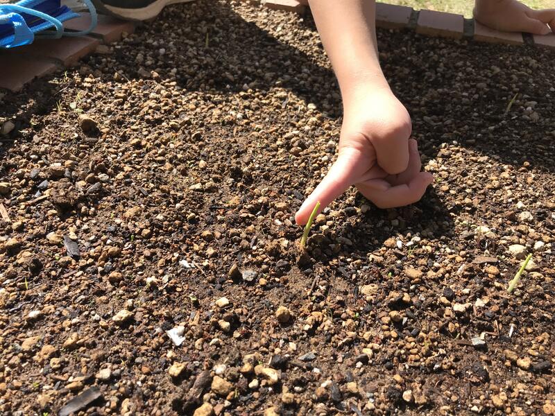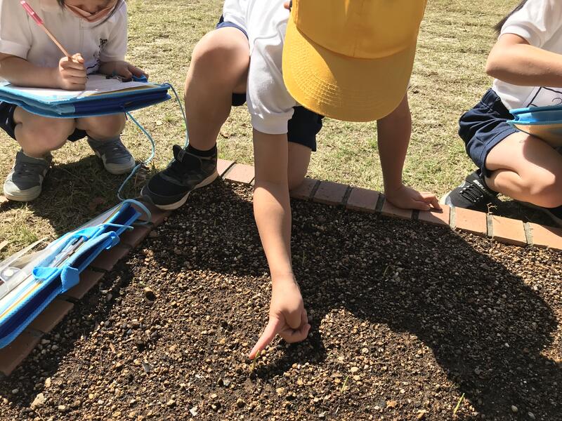 昨日、畑に小さな芽が出ていることに気づき、今日は、みんなで観察することにしました。